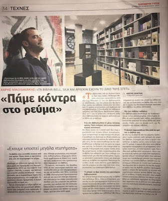 «Τα βιβλία BELL, Silk και Άρλεκιν έχουν το δικό τους σπίτι!». Μεθαύριο Μεγάλη Δευτέρα εγκαινιάζεται στην οδό Εμμ. Μπενάκη 22 ένα νέο βιβλιοπωλείο, το BELL books, και στα ράφια του θα βρείτε όλες εκείνες τις εκδόσεις τσέπης που τα τελευταία 35 χρόνια συναντούσατε στα περίπτερα και στα βιβλιοπωλεία. Ο διευθυντής του εκδοτικού τμήματος των BELL Χάρης Νικολακάκης μιλάει στον «Ε.Τ.» για το ρίσκο της επένδυσης ενός νέου βιβλιοπωλείου σε καιρούς χαλεπούς για το βιβλίο και γενικότερα.